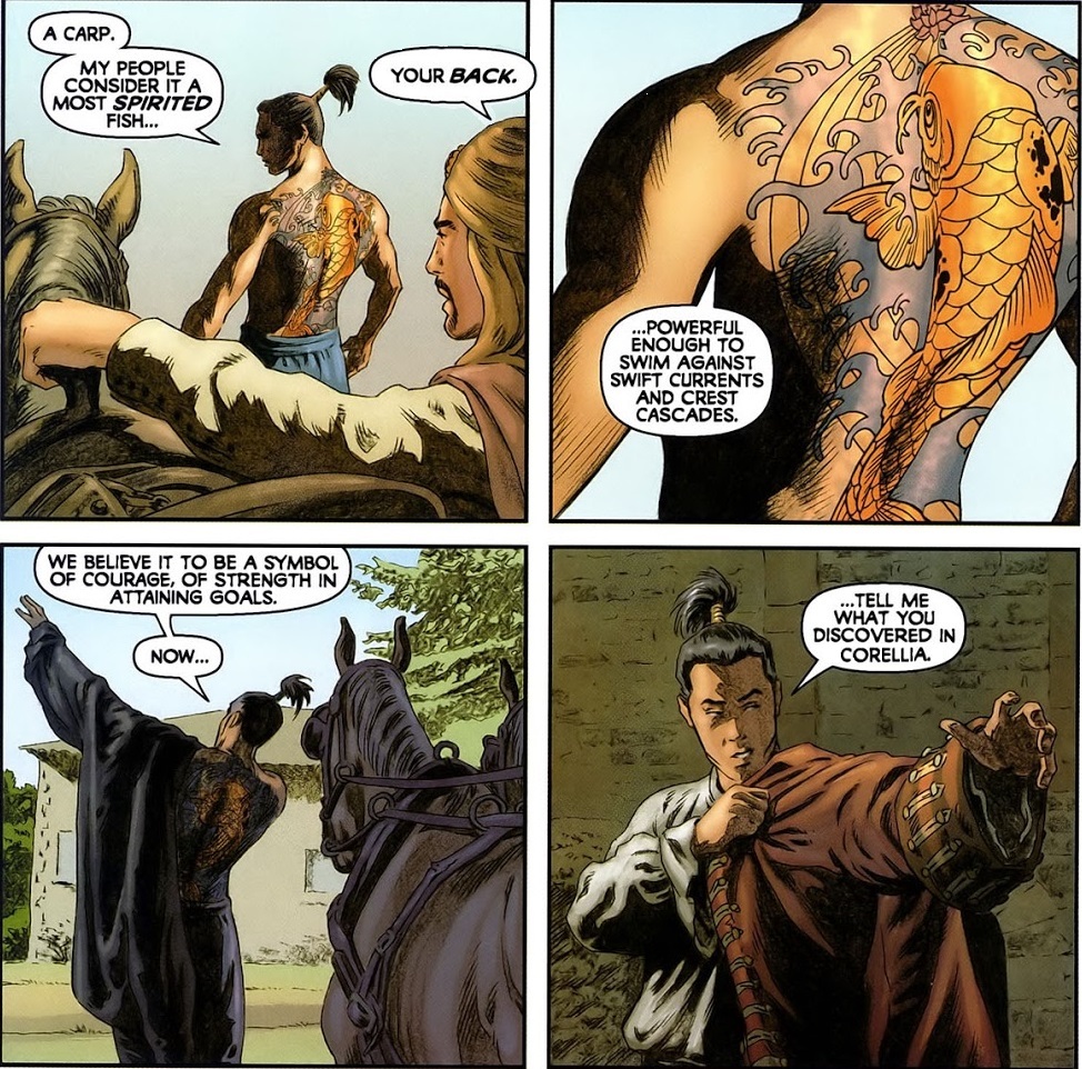 Tattoos: A dragon on his left pectoral and bicep, and a carp on his back. The carp was inked after becoming a Knight, as they swim against currents, and in Gaian culture, symbolise courage and strength of attaining goals. The dragon is a Gaian symbol of wisdom and power, and was fitting to mark his eventual rise to the rank of Master.